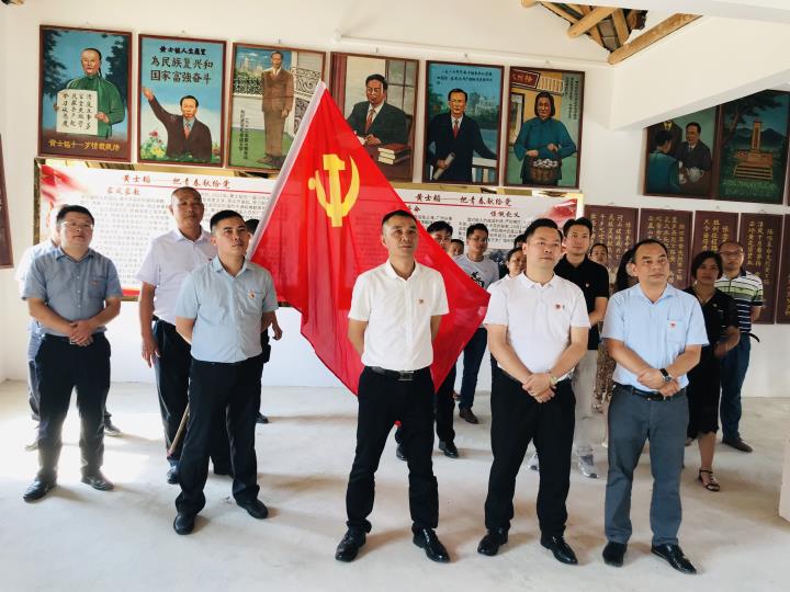 在黃士韜故居,在莊嚴(yán)的黨旗下,黨員們舉起右手緊握拳頭,用鏗鏘有力、慷慨激昂的宣誓聲再次重溫入黨誓詞。